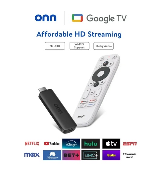 Onn. Dispositivo de transmisión Full HD de Google TV Resolución Full HD Transmite fácilmente tus fotos, vídeos y música con Chromecast integrado Pídele a Google que controle tu televisor con tu voz Accede a películas y programas de TV desde plataformas como Netflix, Google TV, Disney+, MAX y más! Fácil de configurar Tipo de conector: HDMI, Micro USB Tecnologías inalámbricas: MIMO WiFi Funciones de audio: estéreo; Mononucleosis infecciosa Memoria RAM: 1,5GB En la caja encontrarás: 1 dispositivo de transmisión, 1 guía de inicio rápido, 1 control remoto, 2 baterías AAA, 1 cable HDMI, 1 adaptador de corriente tipo Americano (necesita adaptador adicional)